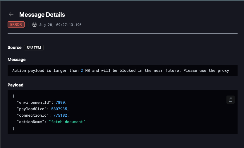 Nango actions currently have a documented output limit of 10MB. We are further restricting that limit to 2MB. Instead of using an action for large payloads like this, we encourage usage of the Nango proxy.Additionally, we will also soon restrict action inputs so please take note of your inputs.