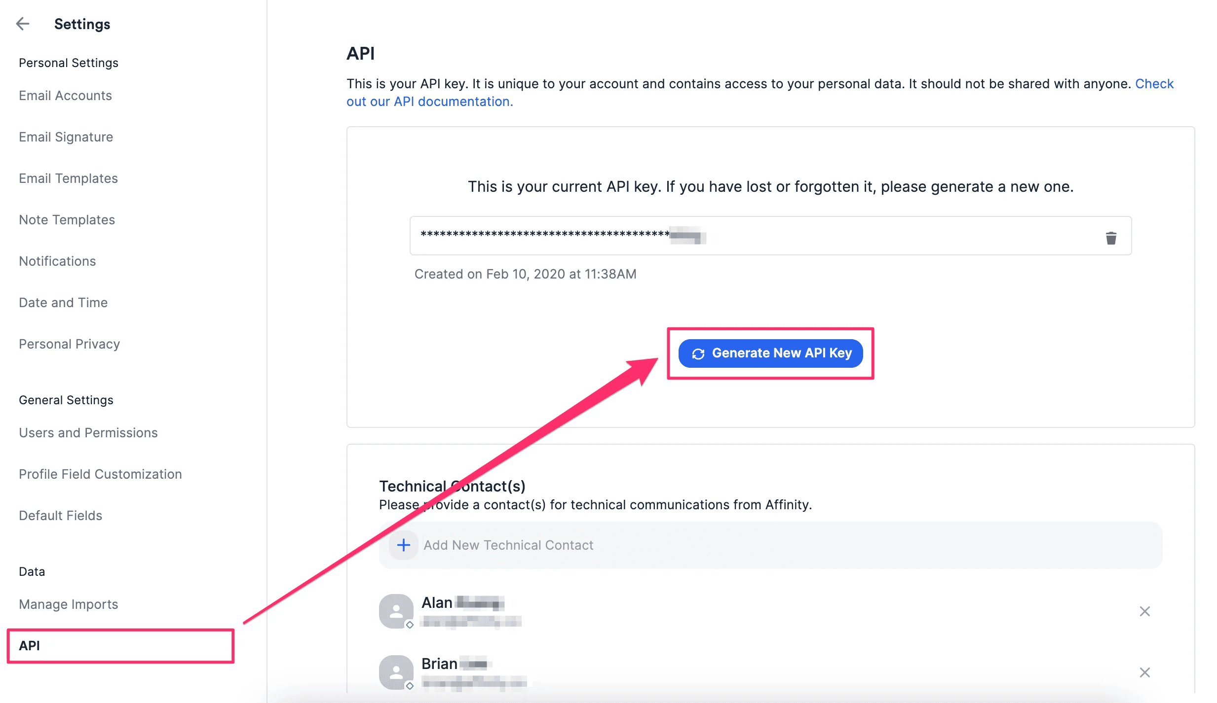 - Log in to your Affinity dashboard and click Settings on the left-side of your screen.