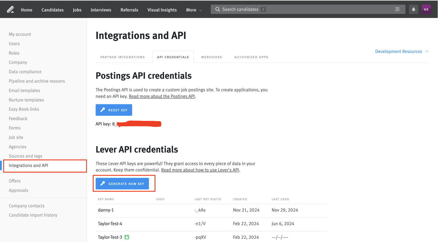 API CREDENTIALStab. Below theLever API credentials, clickGENERATE NEW KEY. - After adding the scopes for the key and display name, click