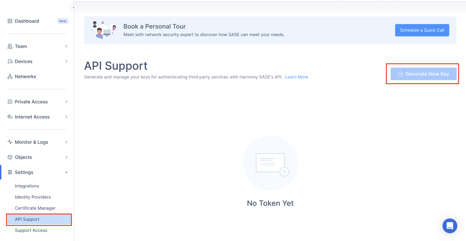 1. First, sign in to your Harmony SASE Admin Console with either the Admin or Manager role and navigate to Settings -> API Support