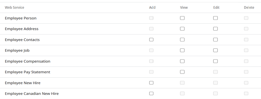 - In the Web Services table, assign the appropriate permissions for the API resources you need to access