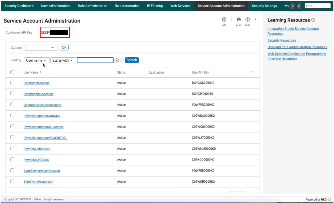 To find your Customer API Key in UKG Pro:- Open the Service Account Administration page