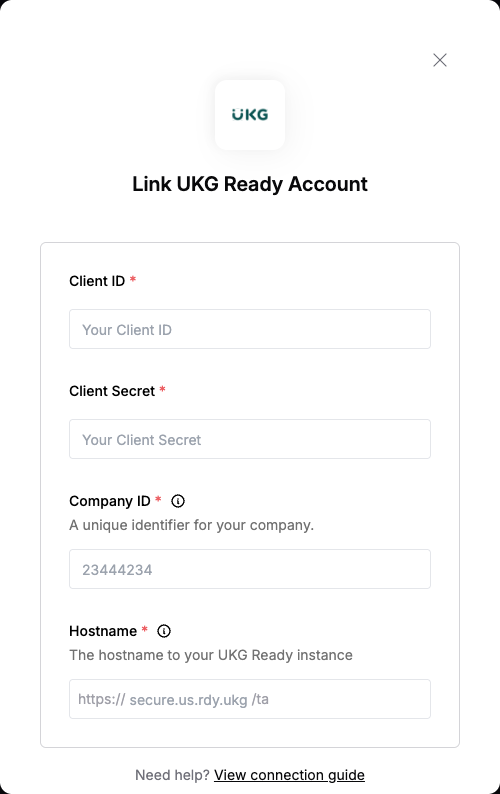 4. Hostname - Your UKG Ready instance’s hostname (e.g., secure.us.rdy.ukg)